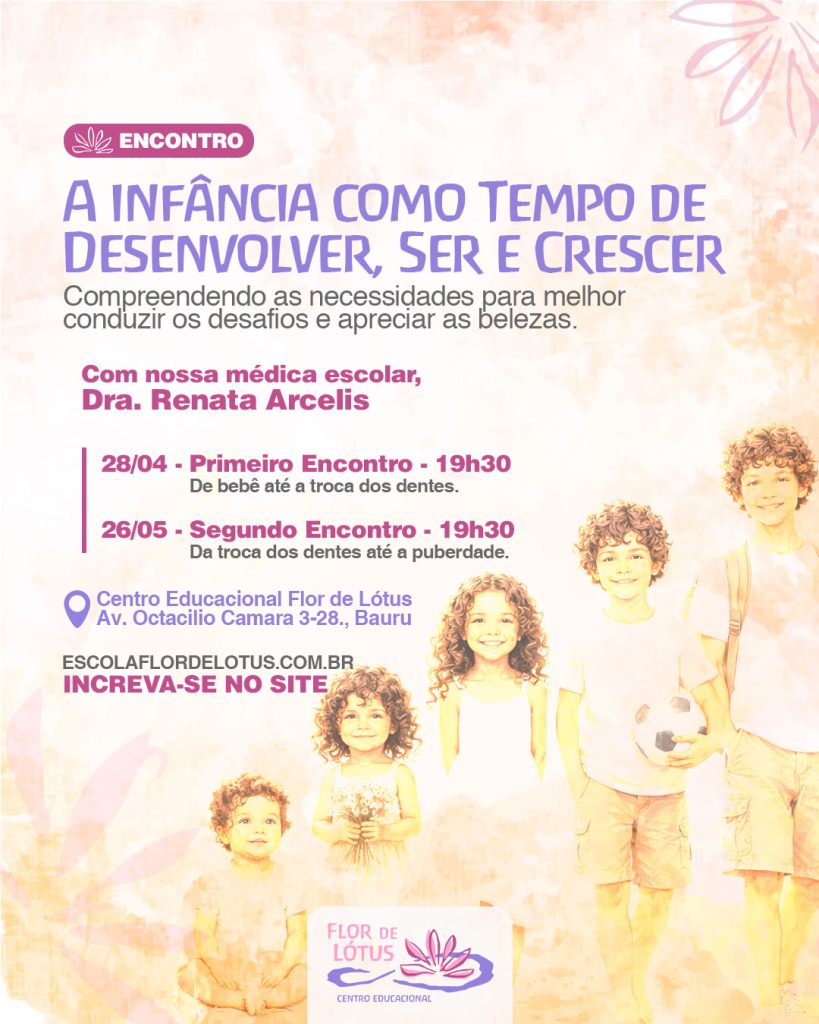 Convidamos com carinho toda a comunidade escolar para participar de dois encontros especiais com nossa médica escolar, Dra. Renata Arcelis, pensados para ampliar nosso olhar sobre a infância e fortalecer nosso caminhar junto às crianças.